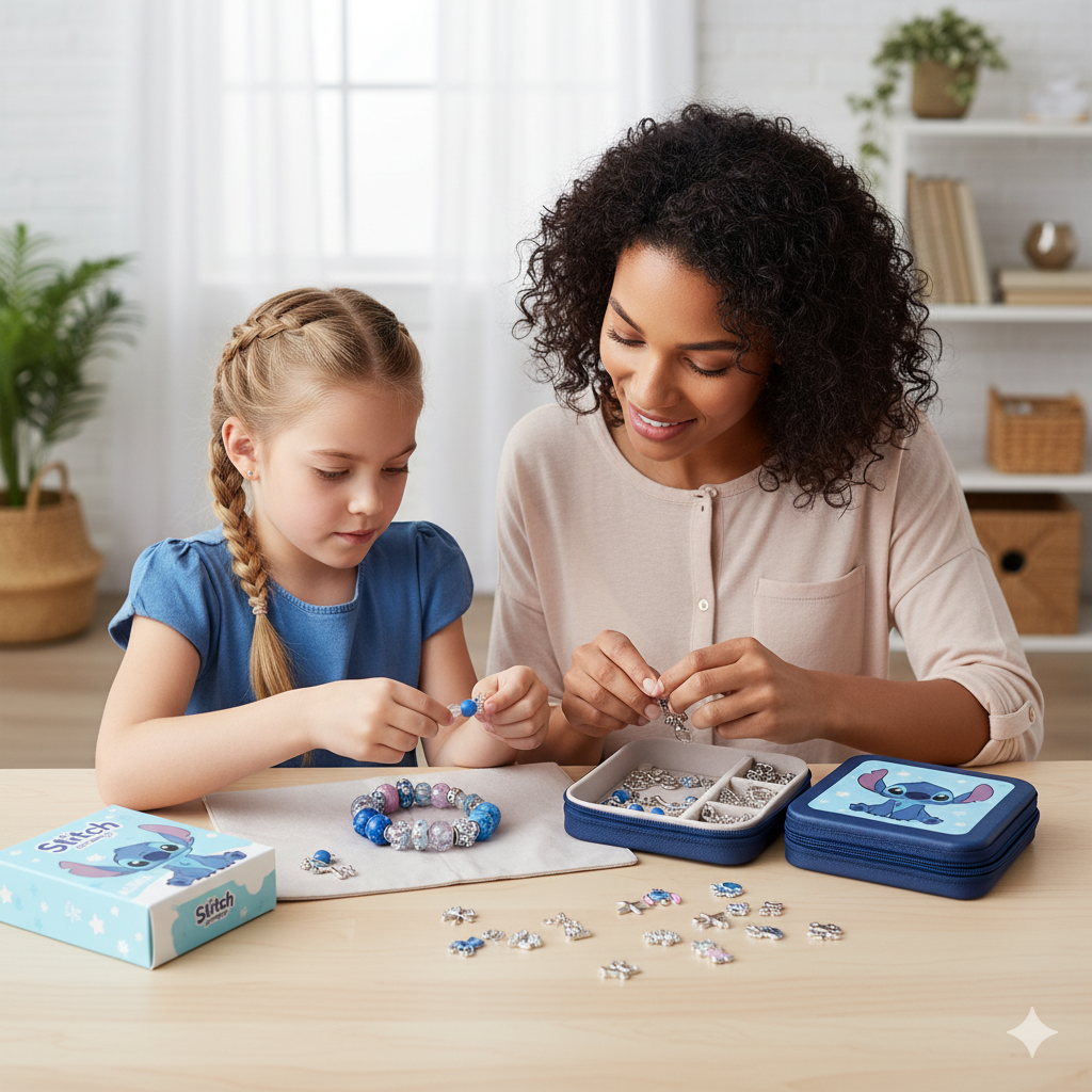 Zabawa, która wciąga na długie godziny — dziecko samo tworzy, projektuje i dobiera charmsy Stitch, jednocześnie rozwijając zręczność i wyobraźnię.